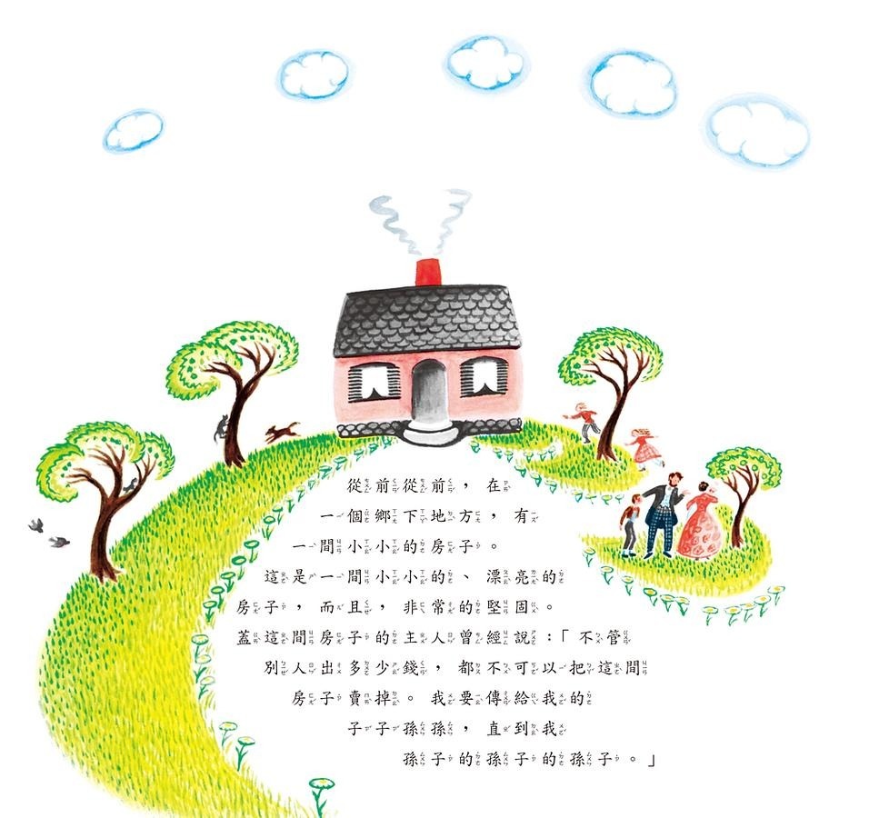 從前在一個鄉下地方,有一間非常堅固漂亮的小房子。蓋房子的主人表示:「不管別人出多少錢,都不可以把這間房子賣掉。我要傳給我的子子孫孫,直到我孫子的孫子的孫子。」
