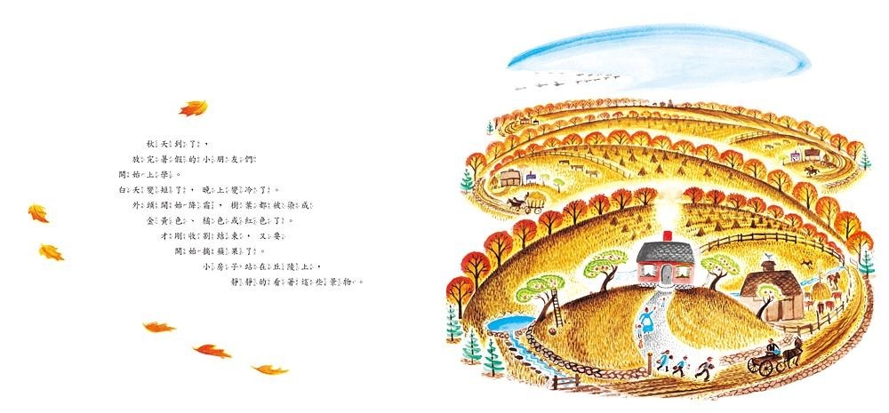小房子站在丘陵上,一邊欣賞風景,一邊過著快樂的日子。從日昇到日落,月亮彎細到月圓,還有春、夏、秋、冬四季的美妙變化──蘋果樹的開花到結果,小雛菊的白茫茫花海,枝頭樹葉從嫩綠轉成金黃……。