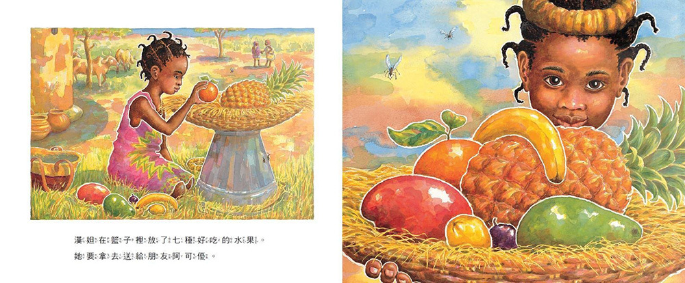 艾琳.布朗描繪了正向、健康、爽朗的盧歐族女孩,也將小讀者熟悉、喜愛的八種熱帶水果對應八種非洲動物放入書中。繪本用色溫暖、飽和,構圖大膽,畫面充滿了生命力。創作者運用翻頁的時空轉換來推進情節,利用主角與讀者的認知落差,製造出幽默的效果與故事張力。