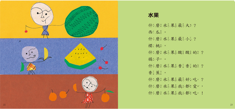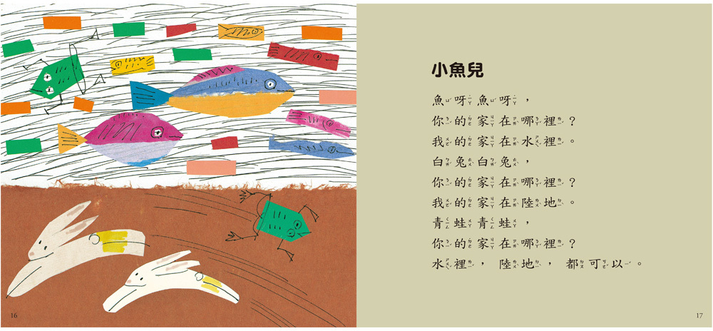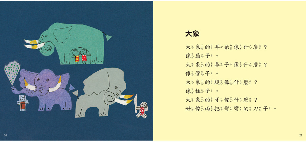 本書採用「問答」兒歌形式,林良爺爺的童詩圍繞著幼兒的生活經驗,內容包含日常寒暄像是「你幾歲?」、「爸爸在哪裡?」、「你家有幾個人?」和孩子感興趣的自然事物與現象像是「大象」、「打雷」,孩子能在一問一答、你說我猜的念唱間,滿足預測答案的樂趣,增進語言表達和思考的能力。除了歌詞能精進幼兒的語言感知之外,趙國宗老師以拼貼風格設計出充滿童趣的插畫,開啟孩子的無限想像,多元的圖素也豐富了親子間的共讀話題。