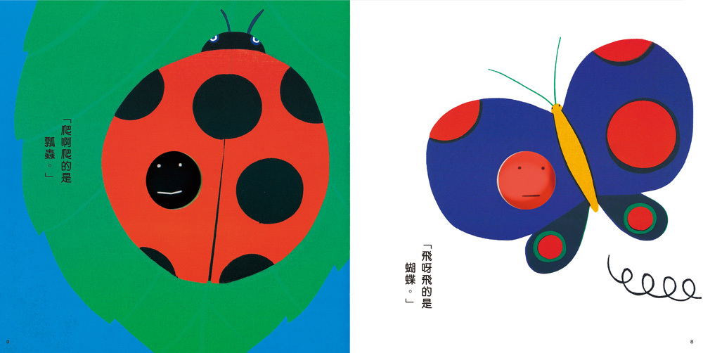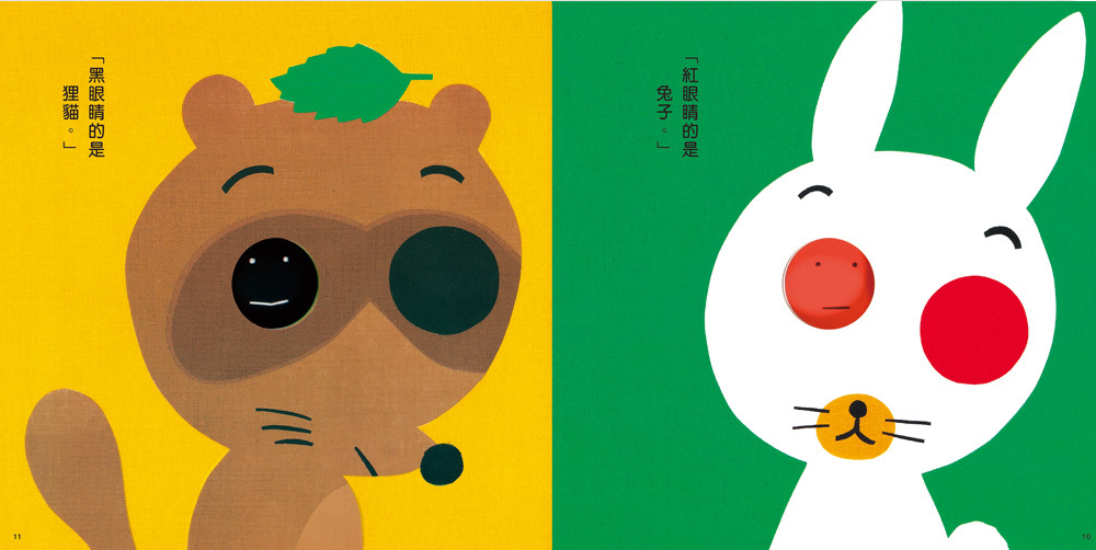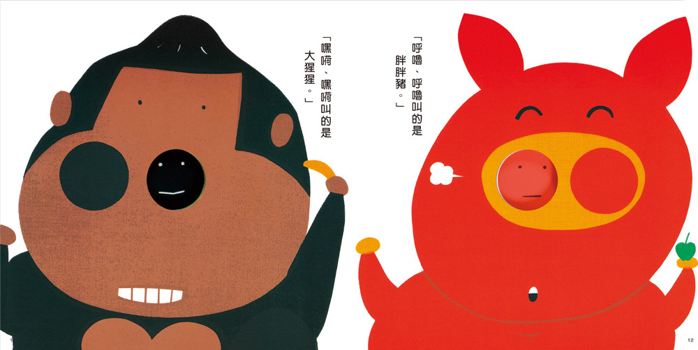 洞洞書是幼兒圖畫書常用的方式,不僅可以透過手指遊戲,學習概念,也能從前後次序中,安排創意的曲折。同時也從手指運動中,學習眼、手、腦的協調性。紅、黑兩色是明視度頗強的色彩,以此兩個圓滾滾的角色,搭配純色的背景,簡單的形象,教導幼兒物象之間的關連與物象外貌的辨別,概念變化隨著劇情,無形中灌輸了正確的思考模式。