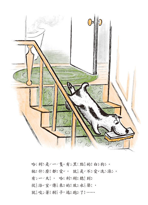 「哈利」是一隻有黑點的白狗。牠什麼都愛,就是不愛洗澡。