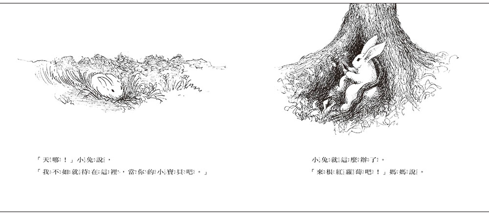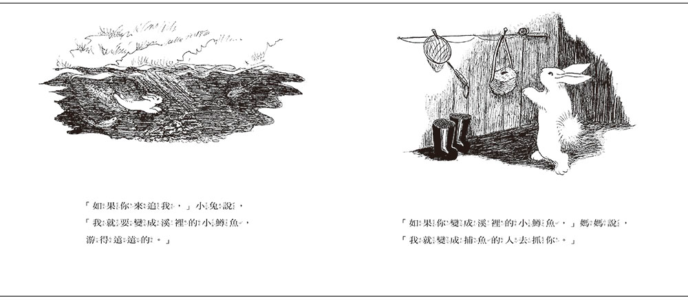 優美簡潔、富有韻味與詩意的親子對話,搭配黑白與彩色畫面穿插的視覺效果,一次又一次把故事推向高潮,也把孩子的想像力拓展到一個無限空間。如:兔媽媽變成捕魚人拿著釣竿,用小兔子愛吃的紅蘿蔔釣他上鉤,展現媽媽的機智幽默,以及了解養育孩子的需求;又如兔媽媽變成一棵樹,等候飛遠的小兔子回來,讓孩子知道不管去哪兒,媽媽的愛永遠都在;最後,兔媽媽和小兔子窩在洞裡,家的庇護與溫馨氣氛,更帶給孩子一種妙不可言的安全感。