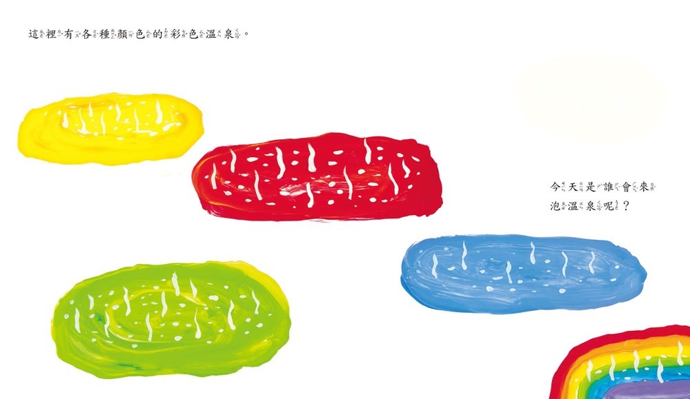 《彩色溫泉》就畫出了各種顏色的溫泉,運用「泡溫泉後變色」的橋段,和小讀者們玩色彩的遊戲。