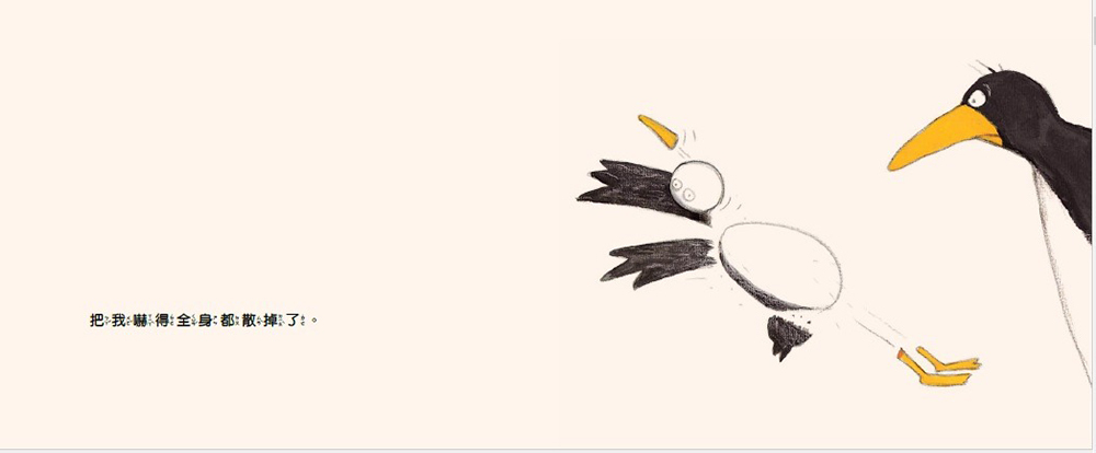 文/張淑瓊(親子天下童書主編)我曾經看過這本書,很多年前(德文版1998年出版),當時在聽專家導賞國外繪本時,對這本外型小巧,但故事情節猛烈的繪本印象深刻。書中不管是情緒爆衝大吼的企鵝媽媽,或是被驚嚇到身體四散分離的小企鵝,角色的造型簡單樸拙、表情幽默傳神,當時真覺得這是本非常有力道的作品。