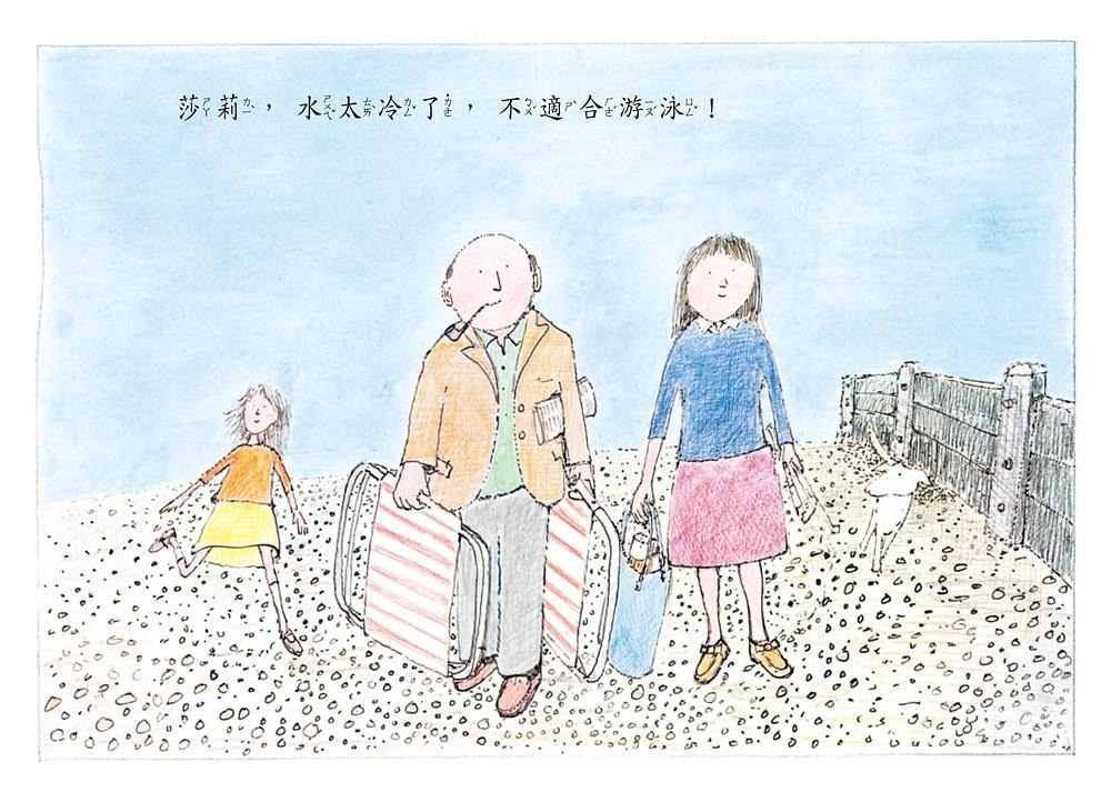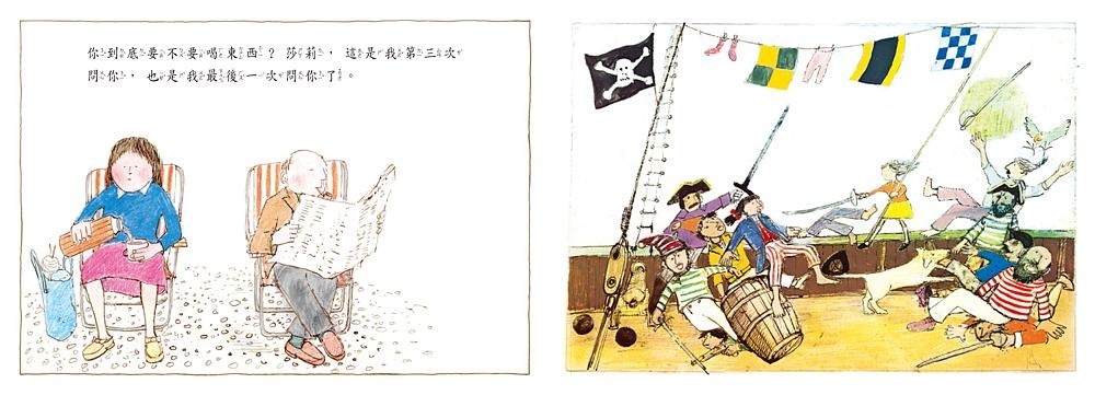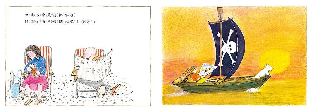 ★「繪本365」書單推介莎莉和父母親一起到海邊。當爸、媽坐在海灘上看報紙、織毛衣,並不時叮嚀她「注意這個」、「不要做那個」,莎莉早已沉浸在自己的幻想中──划著小船,和小狗出海探險去了。作者完全以右頁的圖像來「敘述」莎莉遭遇海盜船、取得藏寶圖、挖到一大箱金銀財寶的驚險歷程。