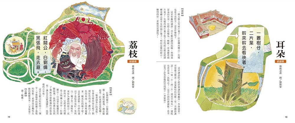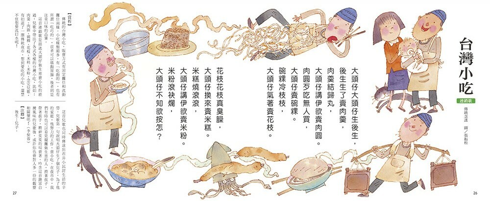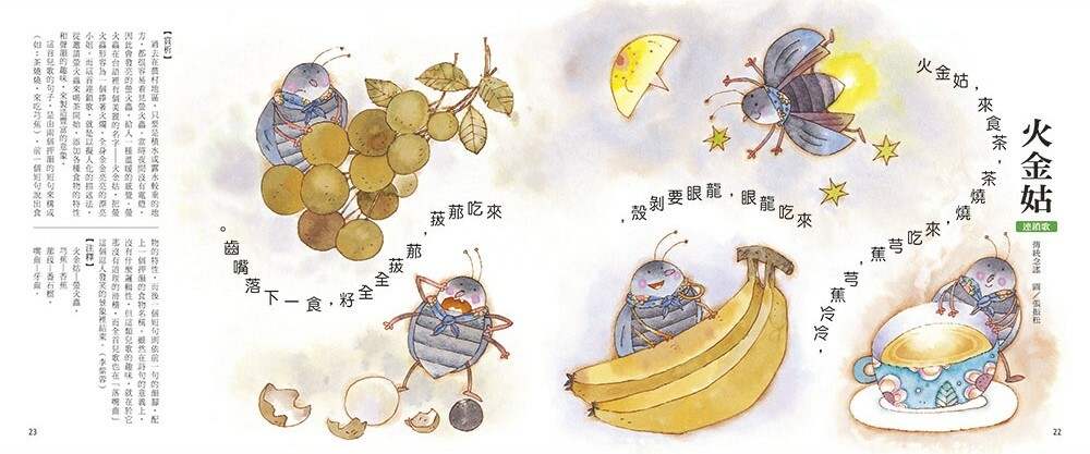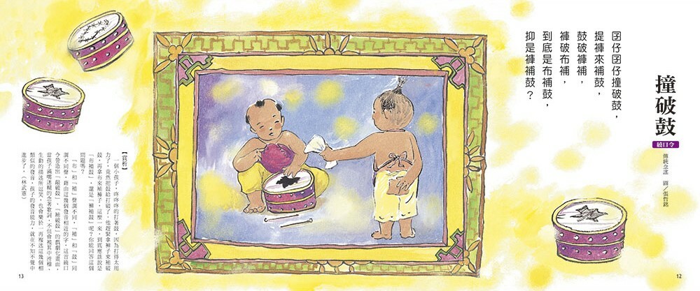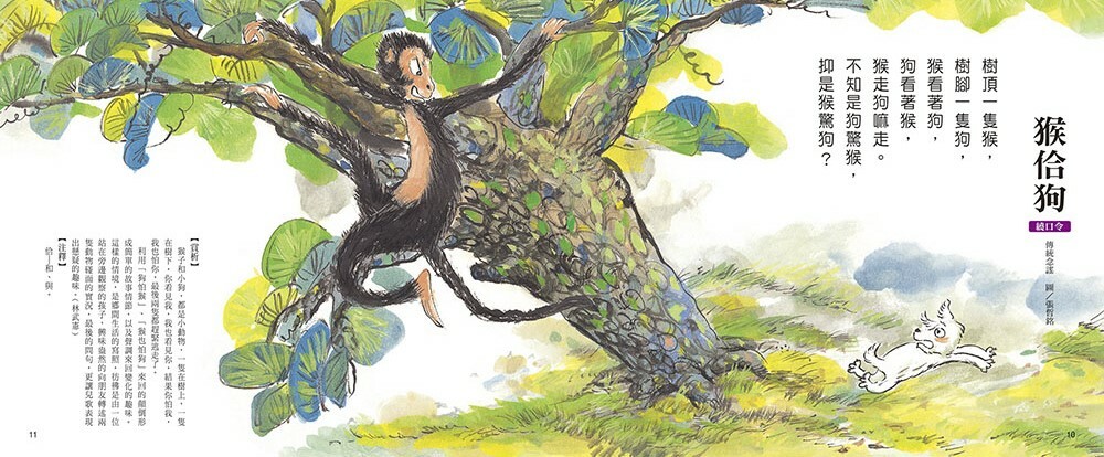 書中歌曲類分為「繞口令」、「猜謎歌」和「連鎖歌」,每首歌都帶有天真爛漫的童趣,也展現了豐富的語文內涵。