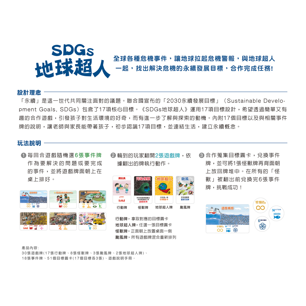 地球發出危機警報!冰山融化、空氣汙染、天然雨林被破壞、傳染病爆發、垃圾量過大......,身為地球公民的一份子,地球超人號召小朋友和他一起找到解決危機事件的永續發展目標,在污染怪獸全部出現之前,合力解決所有的事件,才能解除危機警報成功拯救地球,共同獲勝。