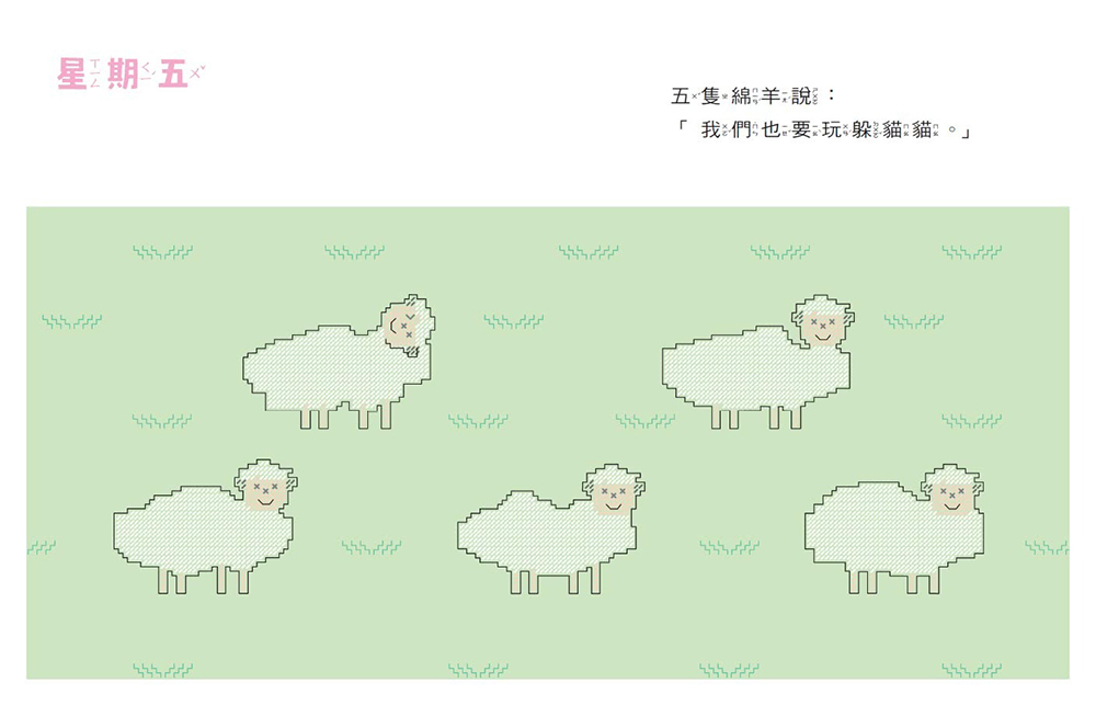 多年前,我買了一本指導「十字繡」的圖案書,充滿手感與溫度,當時心裡就埋下一個意念,相信總有一天會用到。創作這本給幼兒看的圖畫書時,我直覺可以用十字繡來實驗看看,因此開始在紙上試畫、在電腦上試作,也實際買了十字繡材料包來實作。