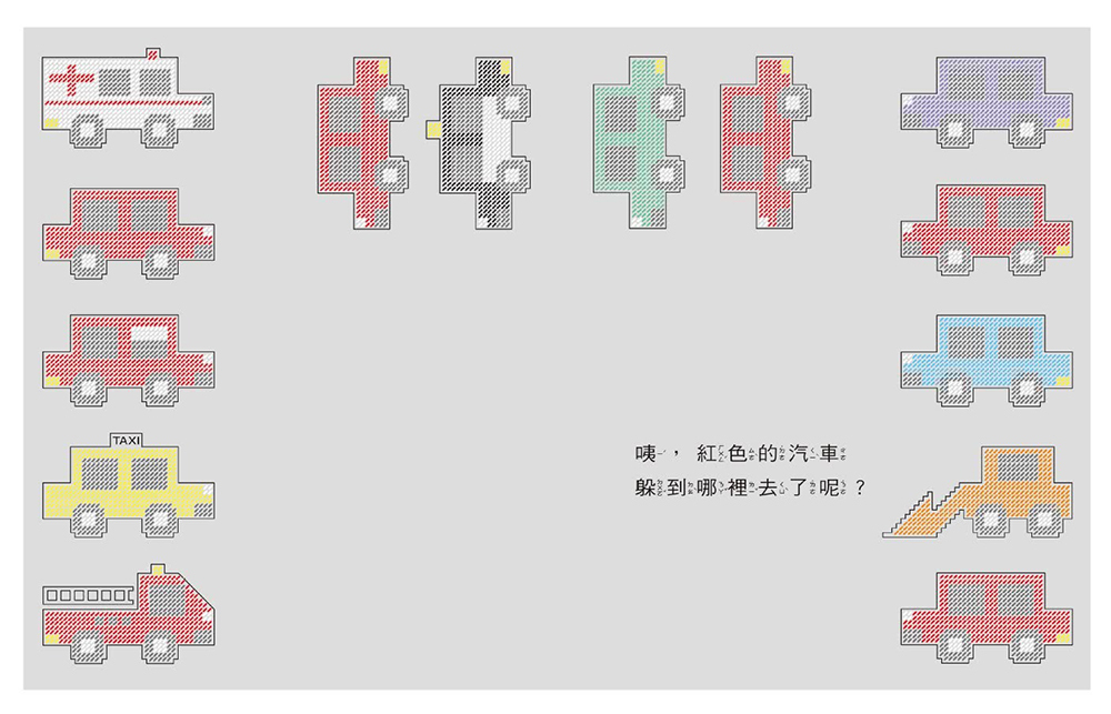 這本小書以巧妙的幽默和優雅的美感,陪伴嬰幼兒玩一場有趣的概念圖像遊戲:數字、時序、空間、顏色、形狀、相似、相異……。十字繡的紋理質感有如柔軟的織物正適合嬰幼兒的感知想像,形成舒適的氛圍,讓處於其中的大人和小孩都會非常愉快的享受這本「可以玩的書」(如艾瑞.卡爾或五味太郎的遊戲精神),一直到最後的驚喜,和滿足。