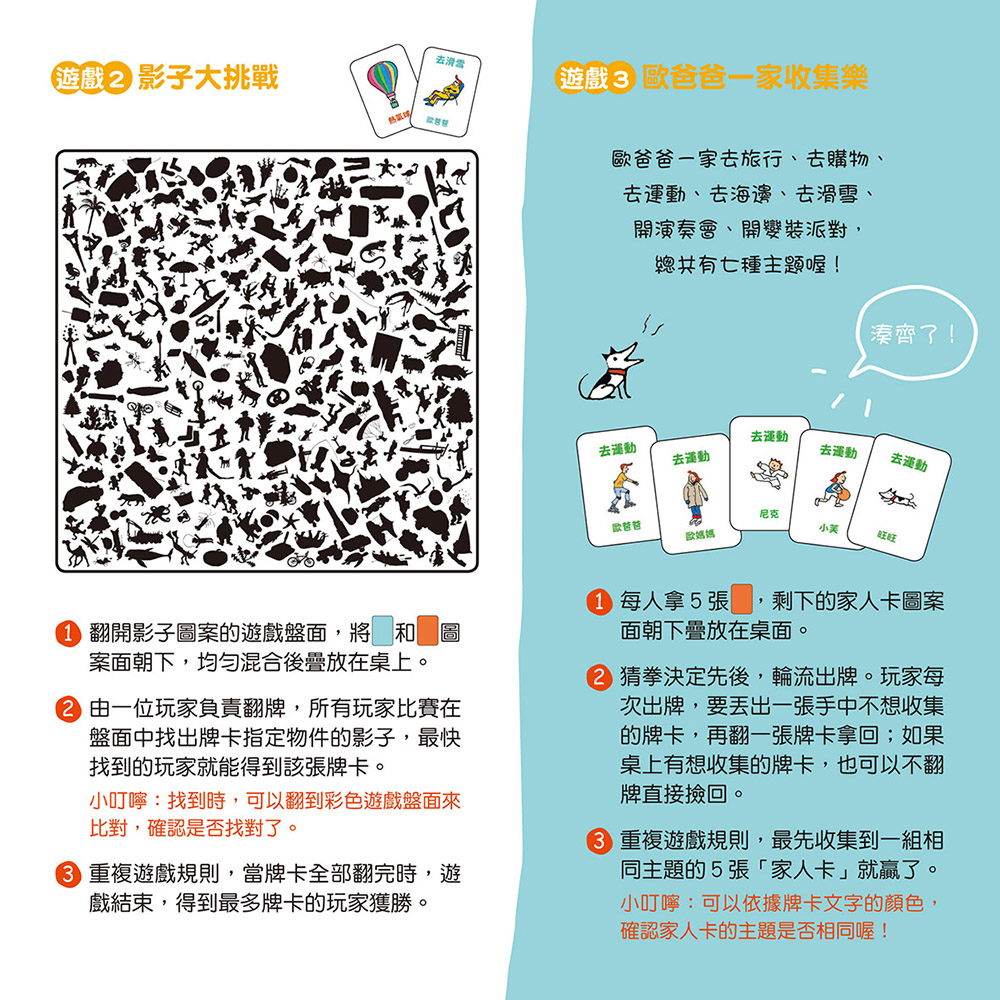 內容物/雙面遊戲盤1個(1面彩色圖案,1面影子圖案)、遊戲說明書1張、3種遊戲牌卡共288張(35張家人卡、37張挑戰卡、216張圖像卡)