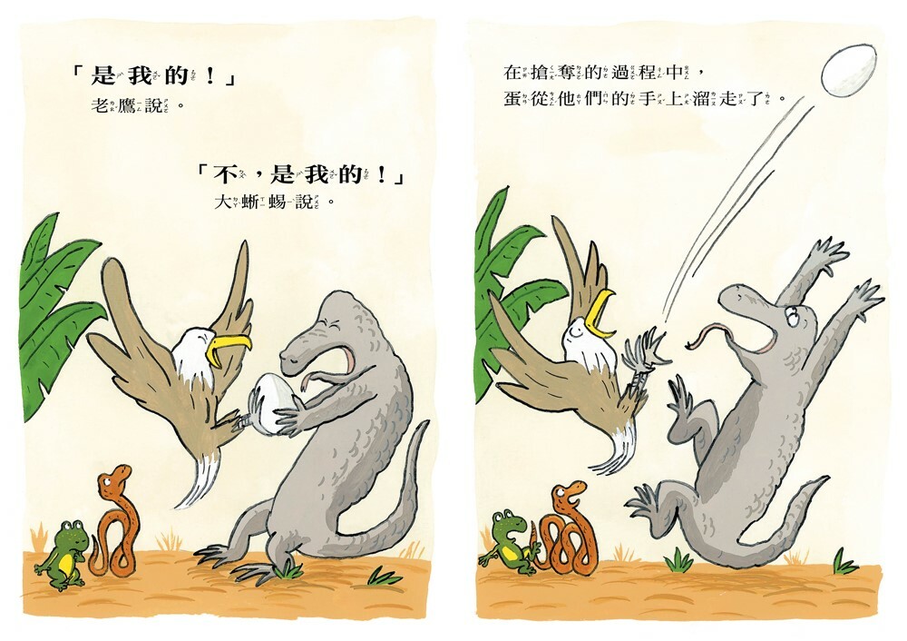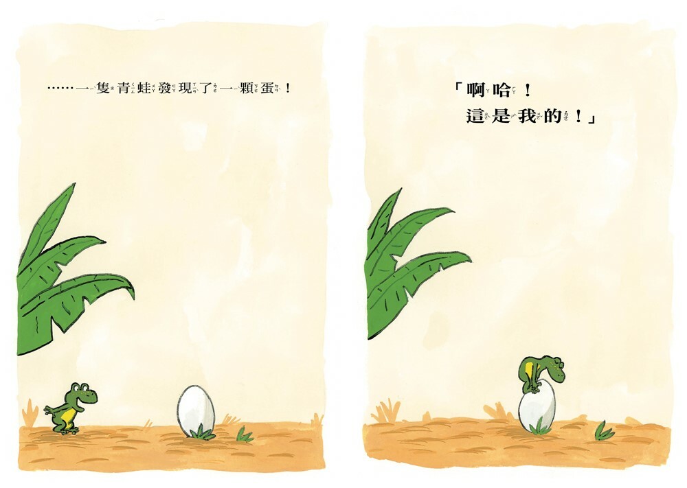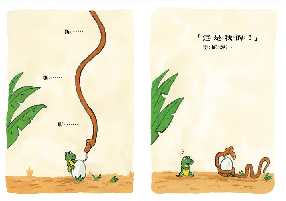 小青蛙在叢林裡撿到一顆蛋,他開心的抱著蛋說:「這是我的!」沒想到蛇和老鷹也說:「這是我的!」,到底這顆蛋是誰的呢?
