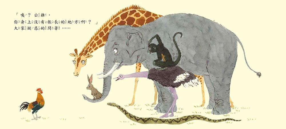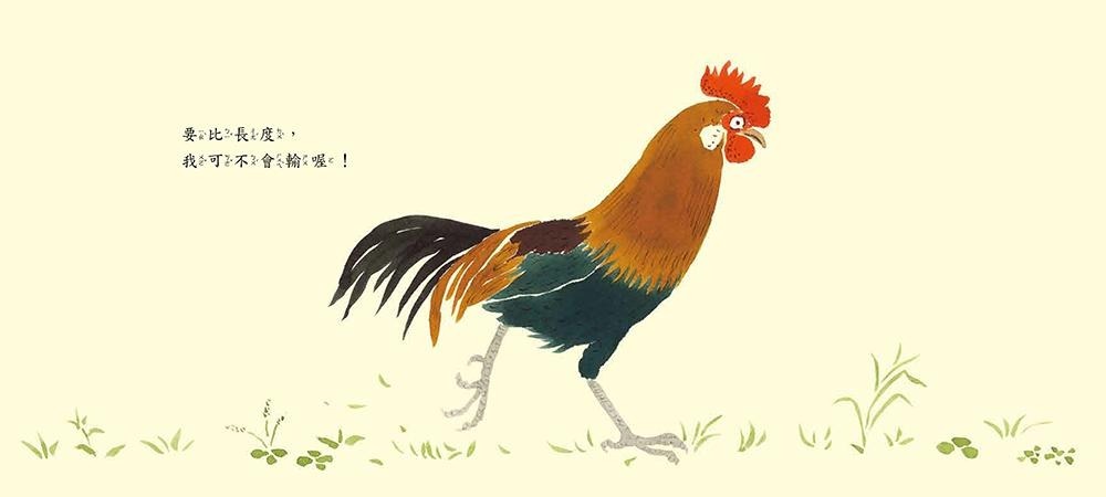 當公雞說他也有很長的地方時,連孩子們都不相信,直到公雞叫了起來,孩子也此起彼落的叫著:「我的叫聲比公雞長喔!」──扉龍媽