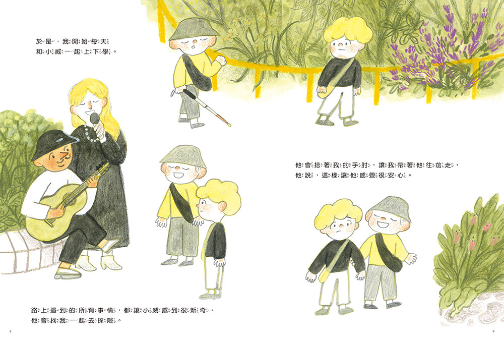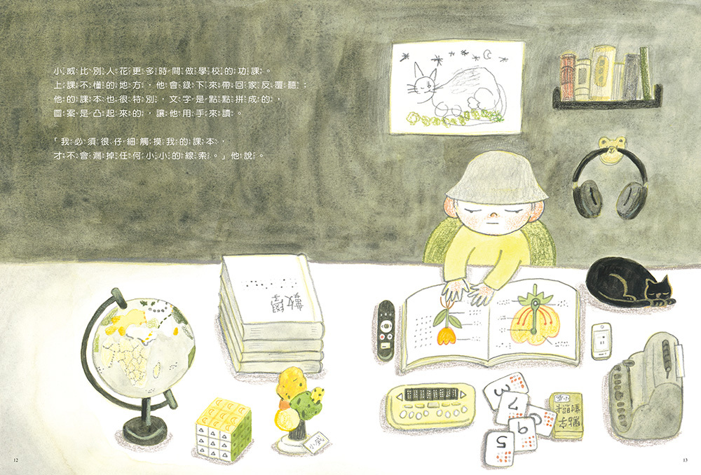 文/杜宛霖《小威的眼睛》創作初衷源自我大學時期的畢業製作。我讀的是平面設計,某方面來說,可以想成是在學如何用視覺藝術來與人溝通,但,如果對方是看不到的情況呢?在對這個答案的好奇下,我和同學計畫製作一套可以讓視障兒童觸摸的學習書作為畢業專題。當時為了研究視障兒童的需求和特質,我們訪談了特教班的老師,並帶著大約十位視障小朋友說故事、試玩為他們設計的自製觸摸式桌遊。