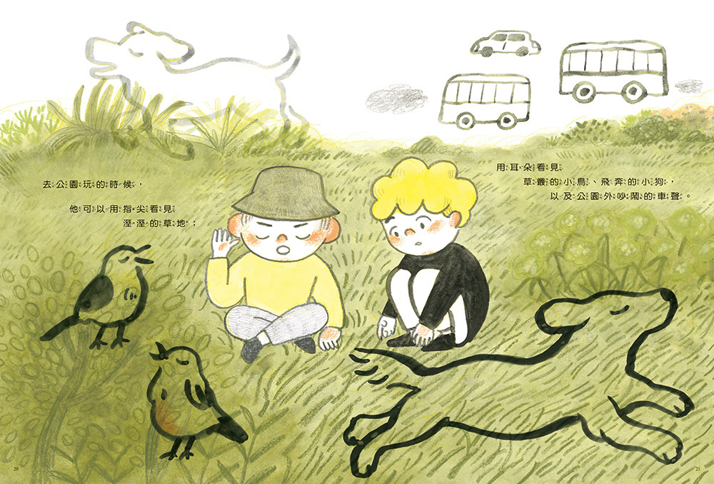我覺得這本繪本不僅僅是兩個孩子的故事,更是一次帶領大小讀者深入心靈的美好旅程。通過阿比的描述,帶著我們進入了一個不是以視覺主導、而是以心靈感知為核心的五感世界。
