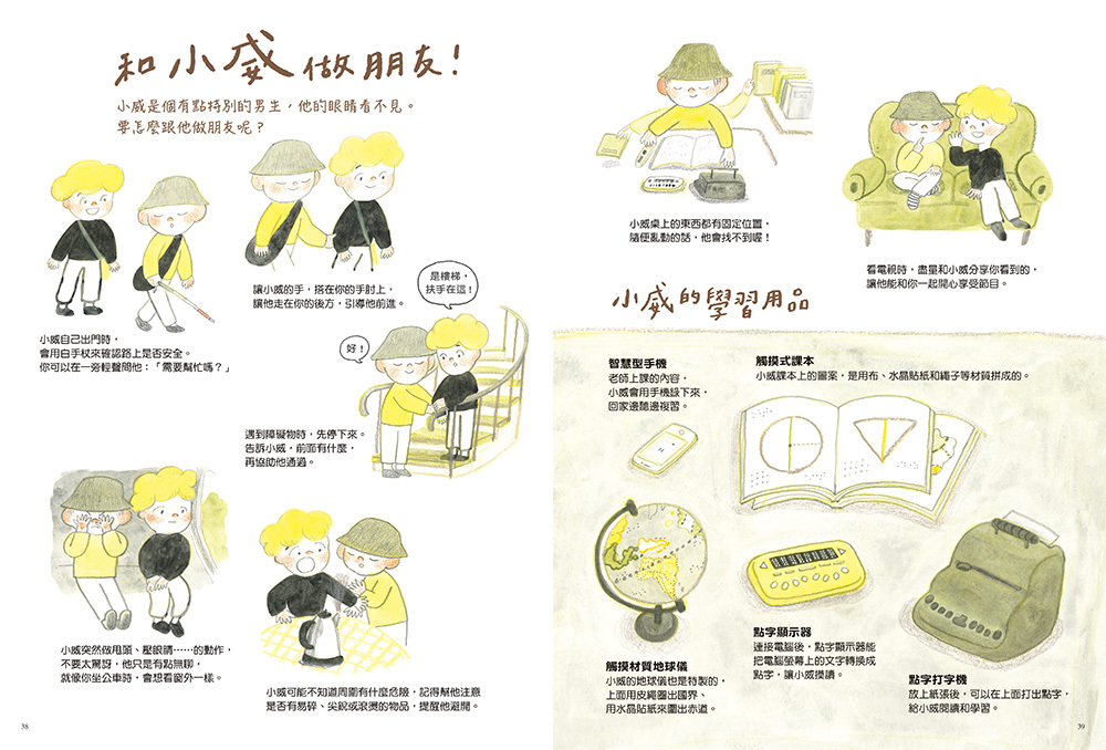 我很喜歡故事最後的小花絮,介紹了視障兒童的日常生活,除了生活習慣和偏好外,也分享一般孩子需要知道的「小知識」,如幫助視障同學的「人導法」、點字打字機、點字顯示器、觸摸式課本、智慧型手機……等,讓孩子們更了解如何幫助視障同學,並更同理他們的生活和需求。