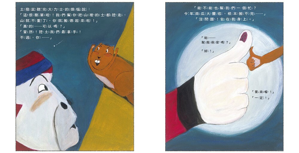 大猩猩尿遁逃跑,一直到土撥鼠幫忙把山挖成空殼,也是有趣的想像,相信孩子和爸媽一起閱讀時,都能會心一笑。這部結構嚴謹、唱作俱佳的幽默故事,從主角、羊群到小鳥配角的營造與情節呈現,皆富喜劇感,整體讀來絕無冷場。最後土撥鼠面對觀眾的提點效果,更有其餘味;羊群對比大力士,特別是剛出生的小羊也能輕易舉起山,生動表現山左大力士換人當的幽默,而大猩猩去山的右邊吃南瓜派,發現眼前要搬的南瓜山如此高聳巨大,忍不住又以尿遁脫逃,在故事前後呼應的連結上,做出了絕妙逗趣的設定,令人不禁莞爾。