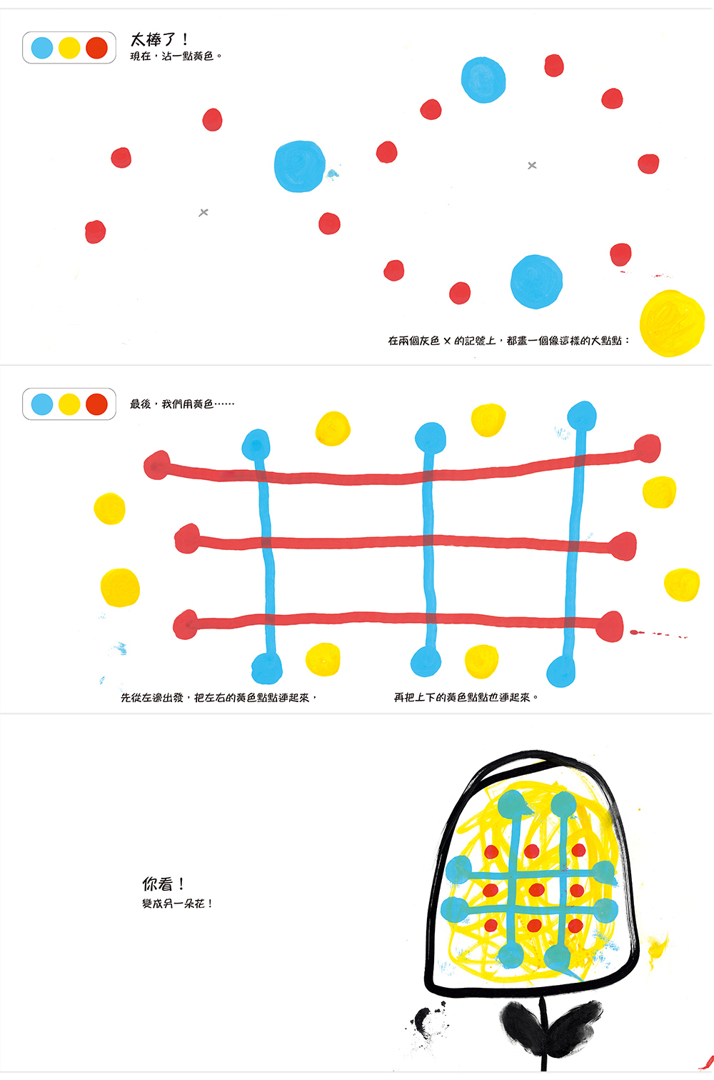 在這本書裡,孩子會發現:原來剛剛畫的點點能妝點出一朵花!兩個點點相連可以變成線條;線條也能組成格子或是形狀,幾何的形狀、有機的形狀,形狀裡再加入點點、線條和塗鴉的組合,圖像就能被點綴得更加豐富。