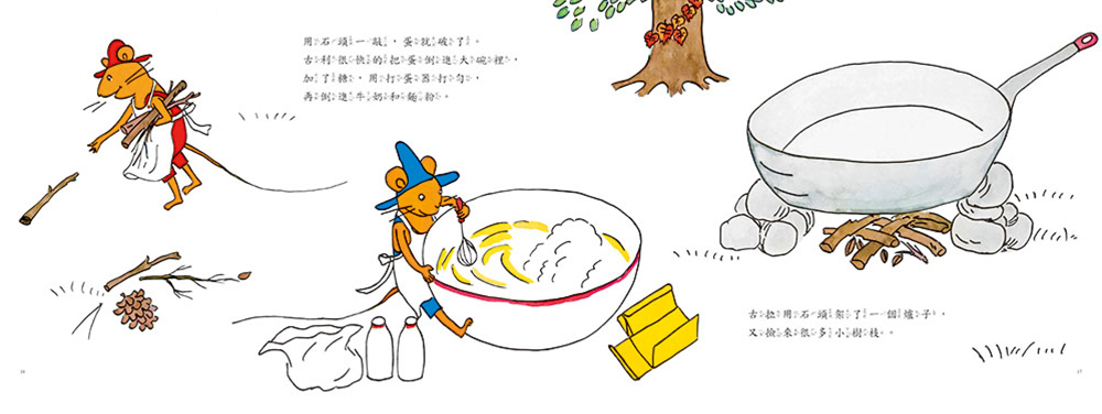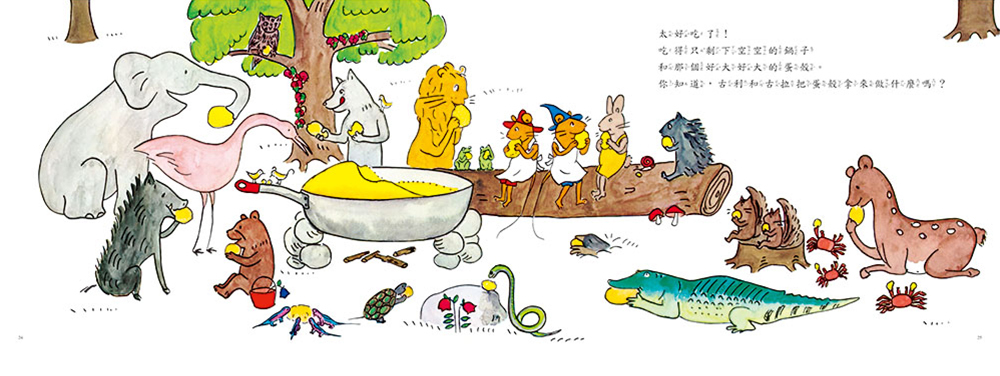 不過,他們最後決定烤一個蛋糕,一個從早到晚都吃不完的大蛋糕。接著他們回家去,把最大的鍋子、麵粉、奶油、牛奶、糖、大碗、打蛋器等工具和材料拿來,準備在森林裡烤一個金黃色的大蛋糕。可是這麼大的蛋,要怎麼打破呢?