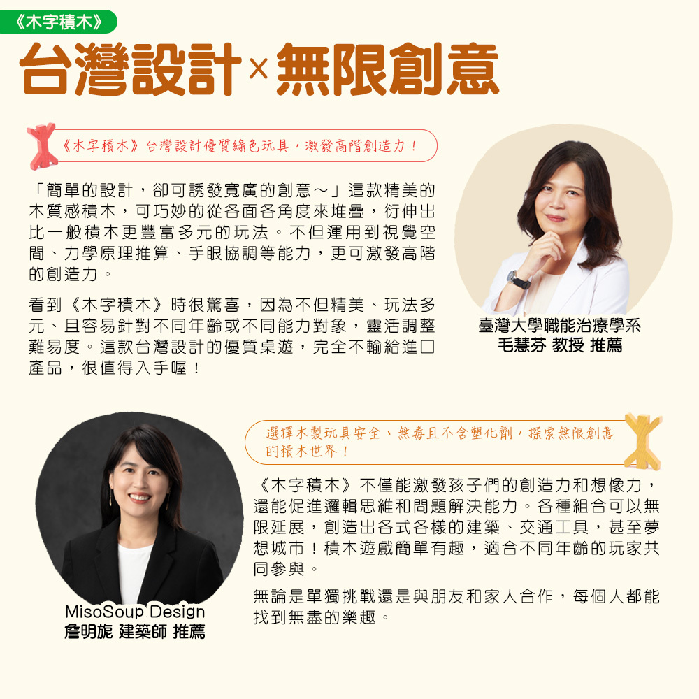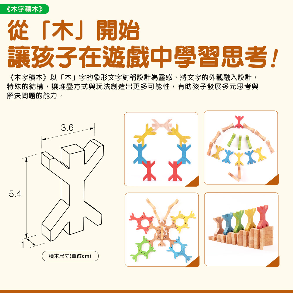 產品特色 1. 從「木」開始,讓孩子在遊戲中學習思考!《木字積木》以「木」字的象形文字對稱設計為靈感,將文字的外觀融入設計,特殊的結構,讓堆疊方式與玩法創造出更多可能性,有助孩子發展多元思考與解決問題的能力。《木字積木》特別的力矩與角度設計,能堆疊出獨特的造型,讓人有「哇!木字結構這麼穩固!」或「原來我有美感藝術天分!」的驚喜感。