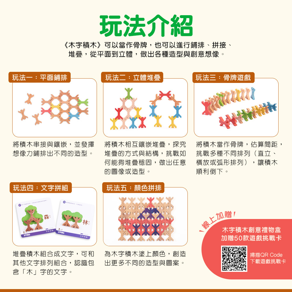 ★《木字積木創意禮物盒》加贈50款遊戲挑戰卡,點此下載👉 品牌介紹【和誼創新】和誼創新以「Keep playing.Be smart」品牌精神為核心,秉持讓孩子「安心玩、快樂學」的理念,致力研發教育性玩具,讓孩子能邊玩邊學,促進感覺統合、語文、認知、社交等方面的能力發展。我們研發的玩具不僅在台灣、大陸、日本、歐洲等地銷售,更代理國際知名桌遊品牌如SmartGames、beleduc、KOSMOS、FLEXIQ等。經幼兒園試玩及研發團隊測試後上市。我們鼓勵家庭一同參與桌遊,促進親子互動。並推廣「全齡桌遊」和「樂齡桌遊」,透過體驗活動和課程,讓長輩、大人、小孩都能在「玩」的過程中,享受遊戲所帶來的感動與幸福!此外,我們的木育產品使用天然木材,讓孩子在遊戲中接觸大自然,培養對環境的關愛。透過木育玩具的設計,我們希望孩子能在探索中發展創造力和想像力,享受學習的樂趣。8. 給家長的話與傳統的骨牌積木不同,《木字積木》在堆疊和創作過程中提供了更多變化與挑戰,有助於孩子發展多元思維和解決問題的能力。它既可以像骨牌一樣簡單地遊玩,也能進行鋪排、拼接和立體堆疊,創造出無限可能。《木字積木》也可搭配其他積木配件,或變身獨具風格的居家裝飾品,為生活帶來不同的美感與趣味。