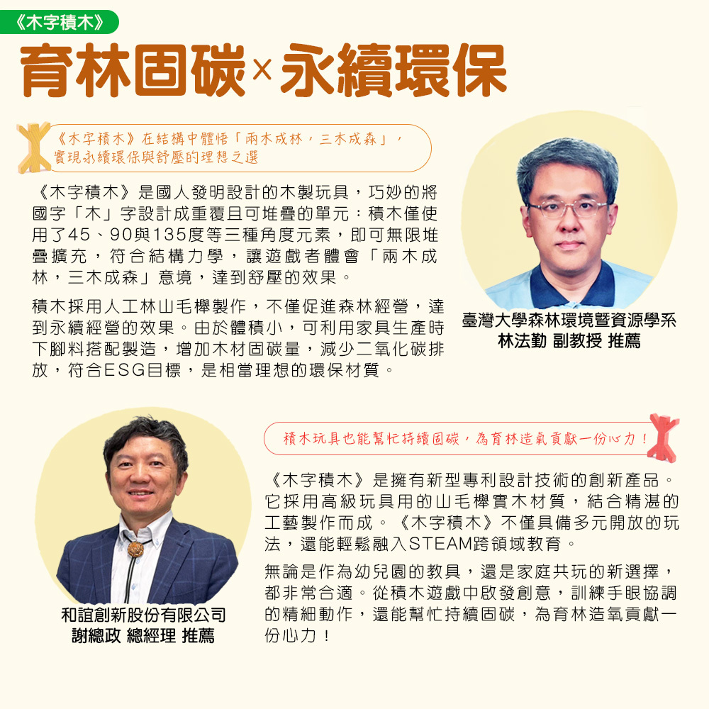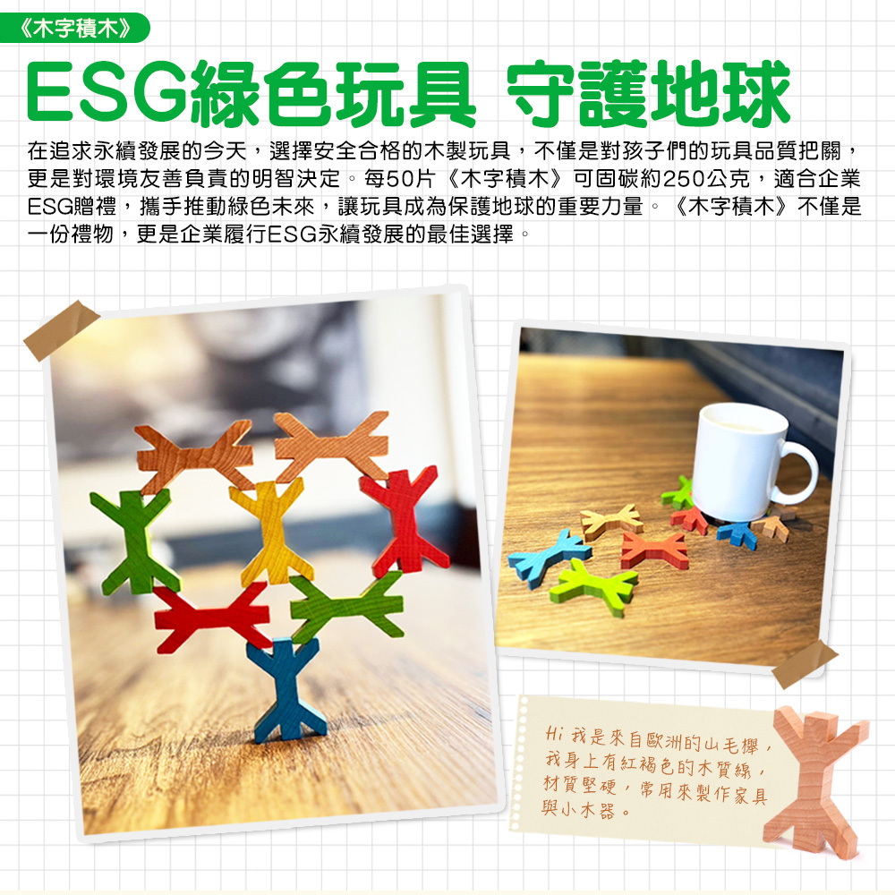 3. ESG綠色玩具 守護地球在追求永續發展的今天,選擇安全合格的木製玩具,不僅是對孩子們的玩具品質把關,更是對環境友善負責的選擇。在享受《木字積木》帶來的樂趣的同時,你也能為地球的未來貢獻一份心力。每50片《木字積木》可以固碳約250公克,適合企業ESG贈禮,攜手推動綠色未來,讓玩具成為保護地球的重要力量。《木字積木》不僅僅是一份禮物,更是企業履行ESG永續發展的最佳選擇。