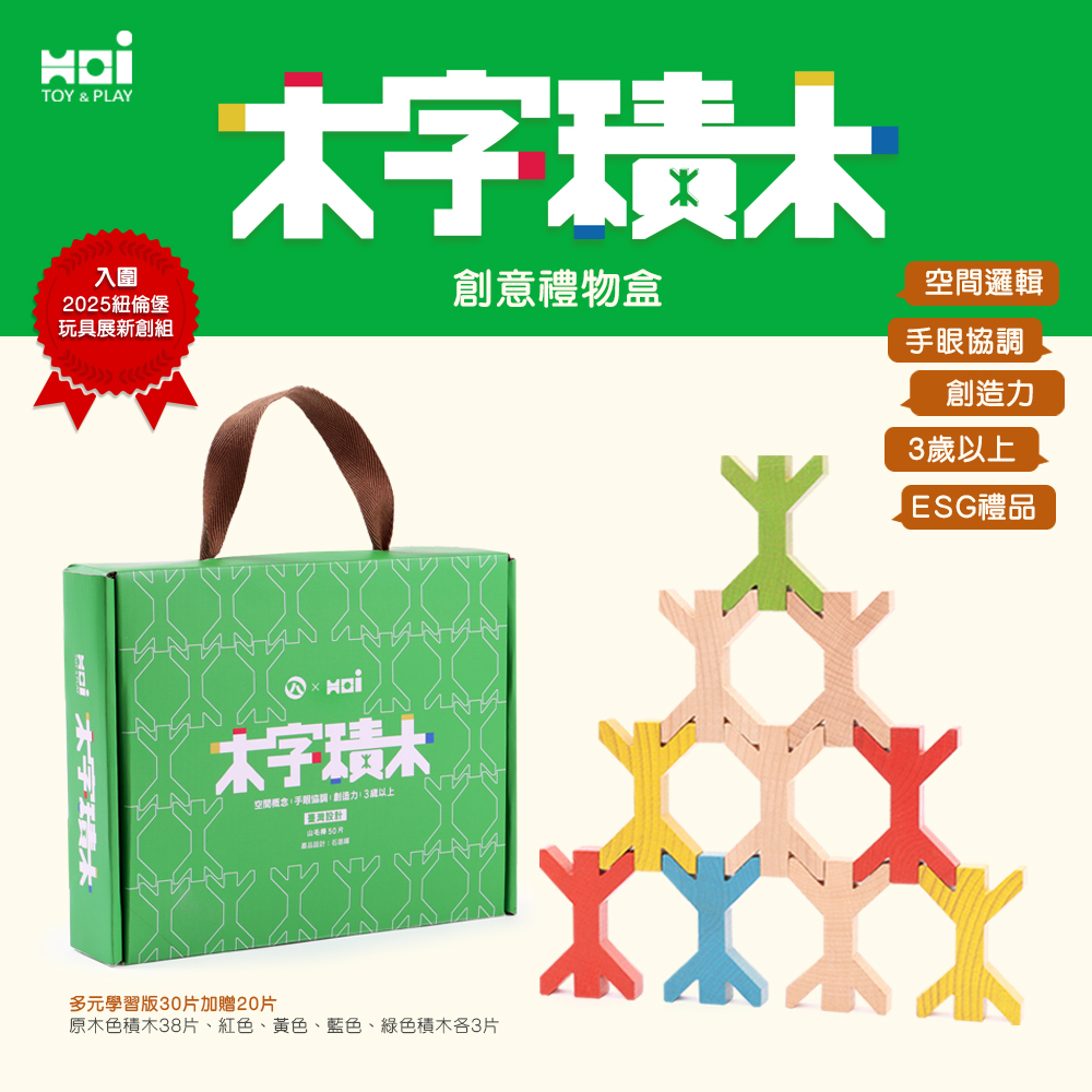 《木字積木》創意禮物盒,30片加贈20片多元學習版,採用高級山毛櫸實木製作,彩色積木的漆料通過國際玩具安全標準,安全無毒,適合各年齡層共同遊玩。每50片《木字積木》可以固碳約250公克,適合企業ESG贈禮,攜手推動綠色未來,讓玩具成為保護地球的重要力量。《木字積木》的設計靈感源自「木」字的象形文字,將文字的外觀巧妙融入遊戲中,讓堆疊與創作的過程充滿變化。它不僅能促進視覺空間感、力學原理推算及手眼協調能力,還能激發高階的創造力。無論作為教具還是休閒娛樂,《木字積木》都是提升創意與認知的全齡桌遊,讓每個人都能在遊戲中獲得啟發與樂趣。