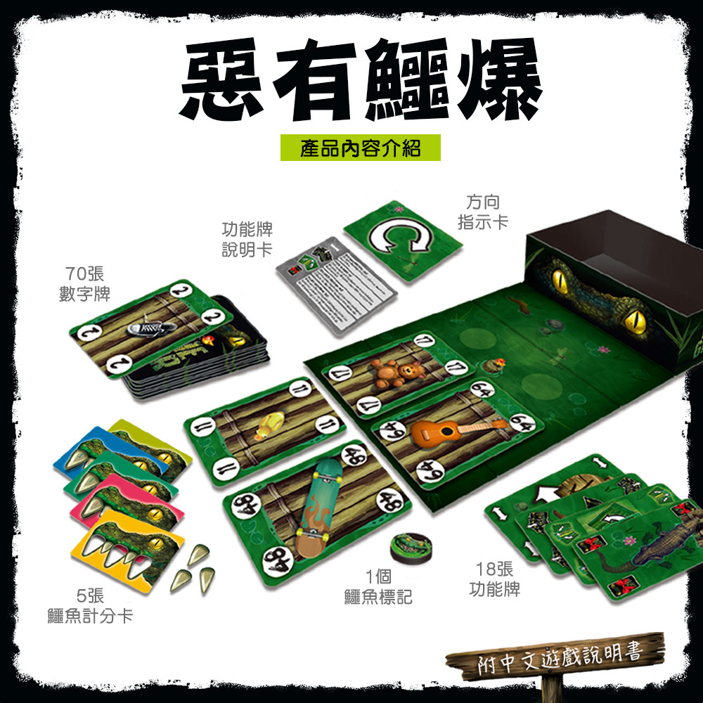 內容物/88張遊戲牌、5張鱷魚計分卡、1個鱷魚標記、1張方向指示卡、2張功能牌說明卡、1份說明書