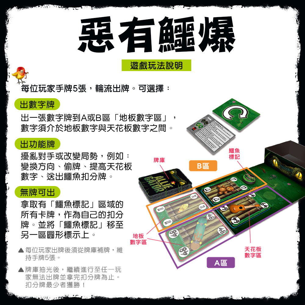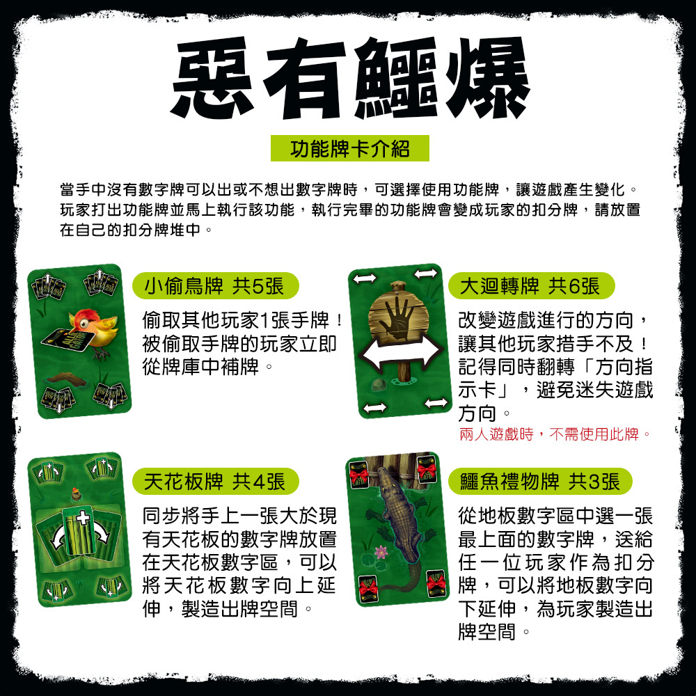 3.功能牌上場 × 樂趣翻倍 4 種功能牌,讓每回合都有新變化!大迴轉牌、小偷鳥牌、天花板牌、鱷魚禮物牌,不僅打亂對手節奏,也為遊戲增添更多笑聲與驚喜。每一張都可能翻轉戰局,讓每一回合都充滿變數與驚喜。