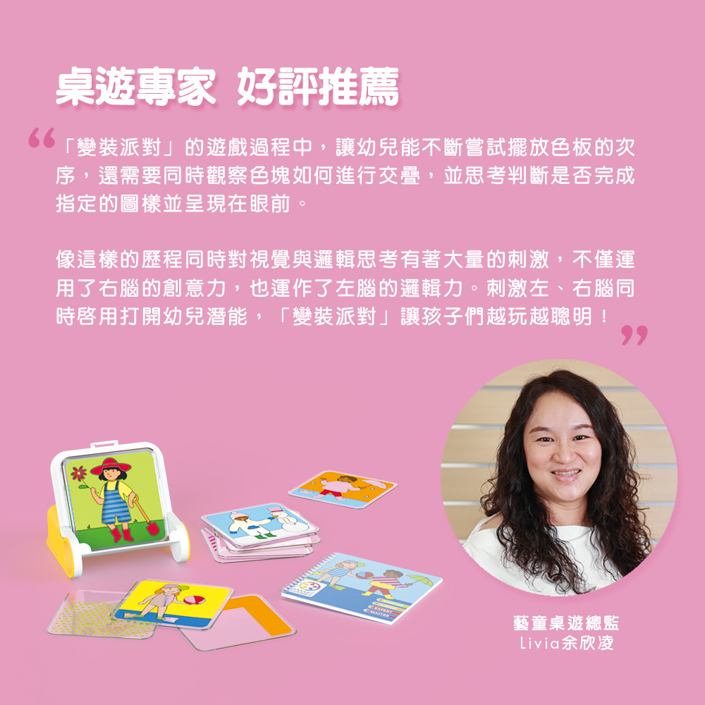 【桌遊專家 好評推薦】藝童桌遊總監 / Livia 余欣凌在「變裝派對」的遊戲過程中,每當幼兒擺放色板時,不僅只是嘗試擺放的次序,還需要同時觀察色板如何進行交疊,並思考判斷是否完成指定的花樣呈現在眼前。這樣的歷程同時對視覺與邏輯思考有著大量的刺激,不僅運用了右腦的創意力,也運作了左腦的邏輯力。「變裝派對」是一款可以刺激左、右腦同時啟用,打開幼兒潛能的益智桌遊,讓孩子們越玩越聰明!