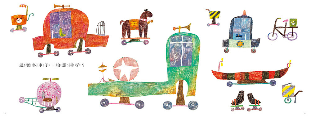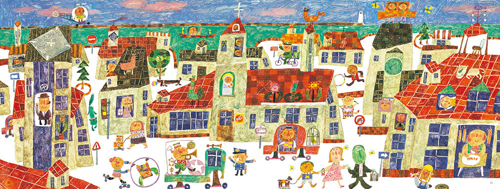 「空間」的概念─將前面出現過的所有角色,重組於大跨頁的空間中,形成一幅豐富、活潑的街頭景象。除了表現各角色相互結合的意義外,同時也呈現了各角色堆疊過程所產生的遊戲性。這就和玩積木一樣,能讓孩子體會整個組構空間的趣味變化。