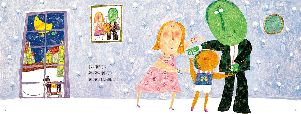 「時間」的概念─畫面裡我也刻意安排了由白天到晚上的變化,想讓孩子體會時間的規律和循環,由此孩子可以觀察熱鬧非凡的白天街景,如何轉變為寧靜的夜晚景致。一些在晚上才出現的角色及景象,如:月亮、星星、貓頭鷹、清道夫、警察捉小偷、觀看星星的人等等,都和白天不同,值得細細品味。