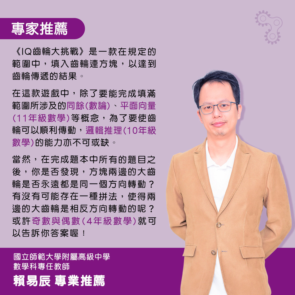 5. 國立師範大學附屬高級中學數學科專任教師/賴易辰 專業推薦 《IQ 齒輪大挑戰》是一款在規定的範圍中,填入齒輪連方塊,以達到齒輪傳遞的結果。在這款遊戲中,除了要能完成填滿範圍所涉及的同餘(數論)、平面向量(11年級數學)等概念,為了要使齒輪可以順利傳動,邏輯推理(10年級數學)的能力亦不可或缺。當然,在完成題本中所有的題目之後,你是否發現,方塊兩邊的大齒輪是否永遠都是同一個方向轉動?有沒有可能存在一種拼法,使得兩邊的大齒輪是相反方向轉動的呢?或許奇數與偶數(4年級數學)就可以告訴你答案喔!