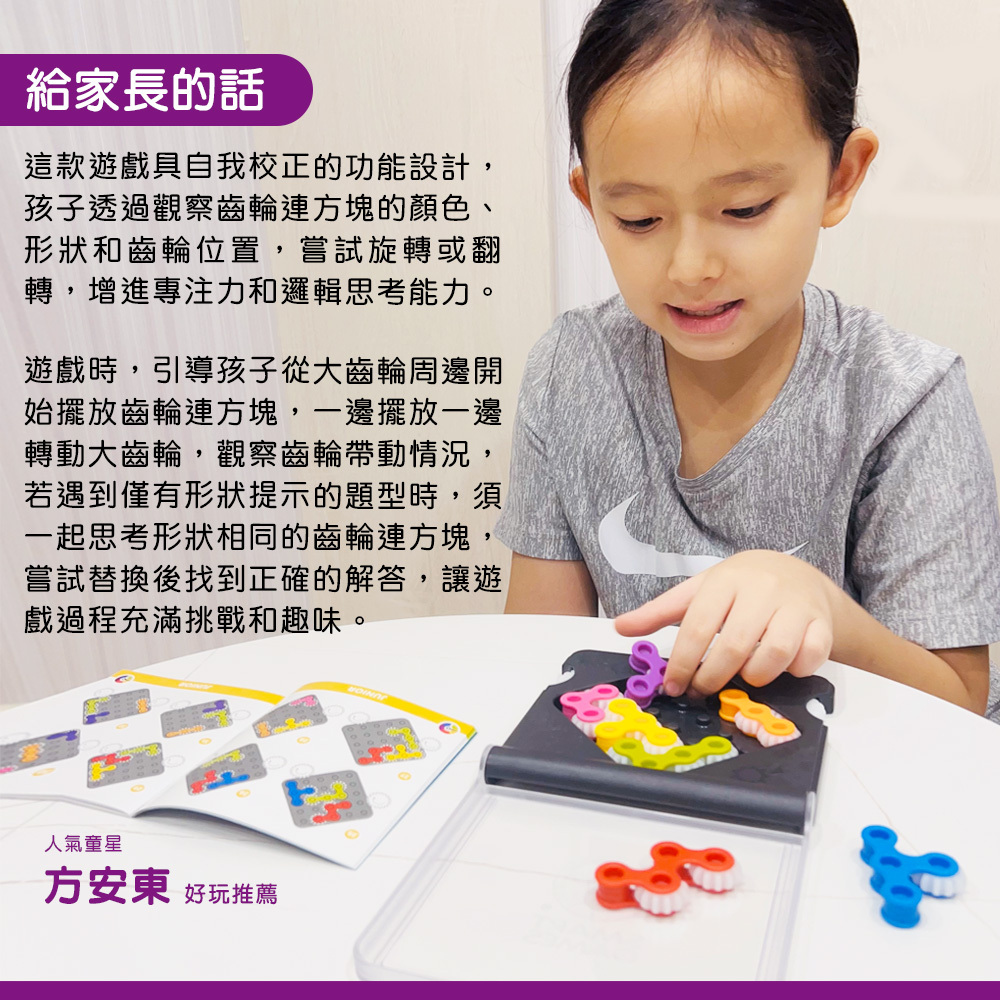 給大人的話《IQ齒輪大挑戰》具自我校正的功能設計,孩子透過觀察齒輪連方塊的顏色、形狀和齒輪位置,嘗試旋轉或翻轉,增進專注力和邏輯思考能力。遊戲時,可引導孩子從大齒輪周邊開始擺放齒輪連方塊,一邊擺放一邊轉動大齒輪,觀察齒輪帶動情況,若遇到僅有形狀提示的題型時,須一起思考形狀相同的齒輪連方塊,嘗試替換後找到正確的解答,讓遊戲過程充滿挑戰和趣味。