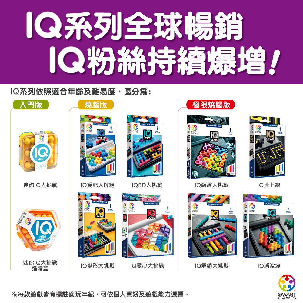 如果是年紀較小的孩子,建議可以從入門版《迷你IQ大挑戰》、燒腦版《IQ愛心大挑戰》入手,開始認識IQ系列的迷人之處!