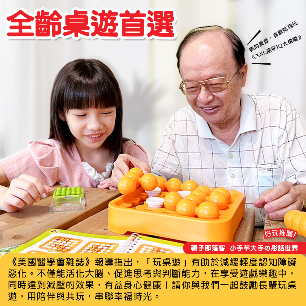 2. 《XXL迷你IQ大挑戰》全齡桌遊首選《美國醫學會雜誌》報導指出,「玩桌遊」有助於減緩輕度認知障礙惡化。不僅能活化大腦、促進思考與判斷能力,在享受遊戲樂趣中,同時達到減壓的效果,有益身心健康!請你與我們一起鼓勵長輩玩桌遊,用陪伴與共玩,串聯幸福時光。
