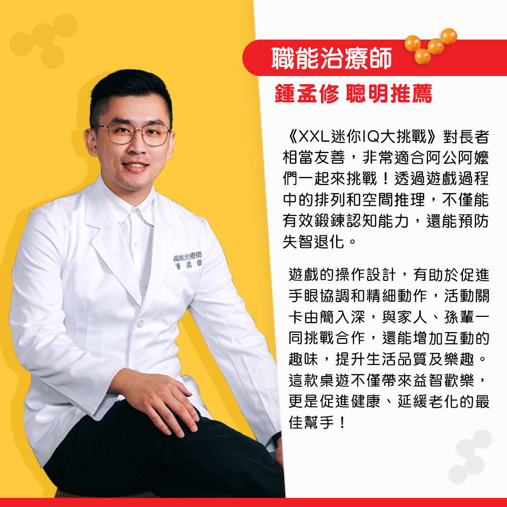 4. 專家推薦/職能治療師 鍾孟修《XXL迷你IQ大挑戰》對長者相當友善,非常適合阿公阿嬤們一起來挑戰!透過遊戲過程中的排列和空間推理,不僅能有效鍛鍊認知能力,還能預防失智退化。