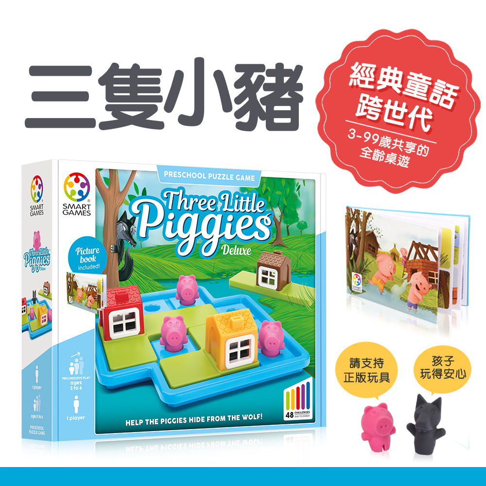 ※遊戲人數:1人自行解題,或2人輪流解題開啟親子、朋友共玩的模式。「三隻小豬」以經典童話故事為背景,讓孩子容易理解遊戲規則,小豬、大野狼公仔偶與立體房屋的設計,讓學齡前的孩子在操作時體驗更真實的遊戲情境。從遊戲中,能促進空間概念與數概念能力的發展,提升口語表達和社會互動能力,並激發其想像力與創造力。遊戲分為白天小豬蓋房屋與夜晚躲避大野狼的情境,共有48個由淺入深的遊戲關卡,幫助孩子循序漸進地學習與挑戰。