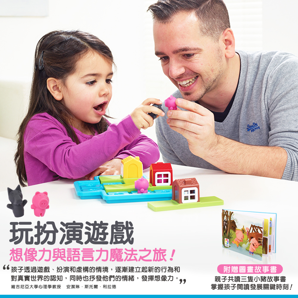 「扮演」是孩子非常喜愛的遊戲方式之一,許多爸媽都知道孩子很喜歡玩扮演遊戲,但並不清楚孩子在想什麼或學到什麼。維吉尼亞大學的心理學教授安潔琳·斯托爾·利拉德是研究兒童扮演遊戲(pretend play)發展及其對兒童認知能力促進的專家。她指出,孩子透過遊戲、扮演和虛構的情境,逐漸建立起新的行為和對真實世界的認知,同時也抒發他們的情緒,發揮想像力。「三隻小豬」可愛精緻的小豬和大野狼公仔偶,讓孩子能自由扮演,進而激發他們的創造性、語言表達能力,以及培養共情和換位思考的能力。從現在起,請欣賞孩子的扮演,也多多和他一起遊戲吧!
