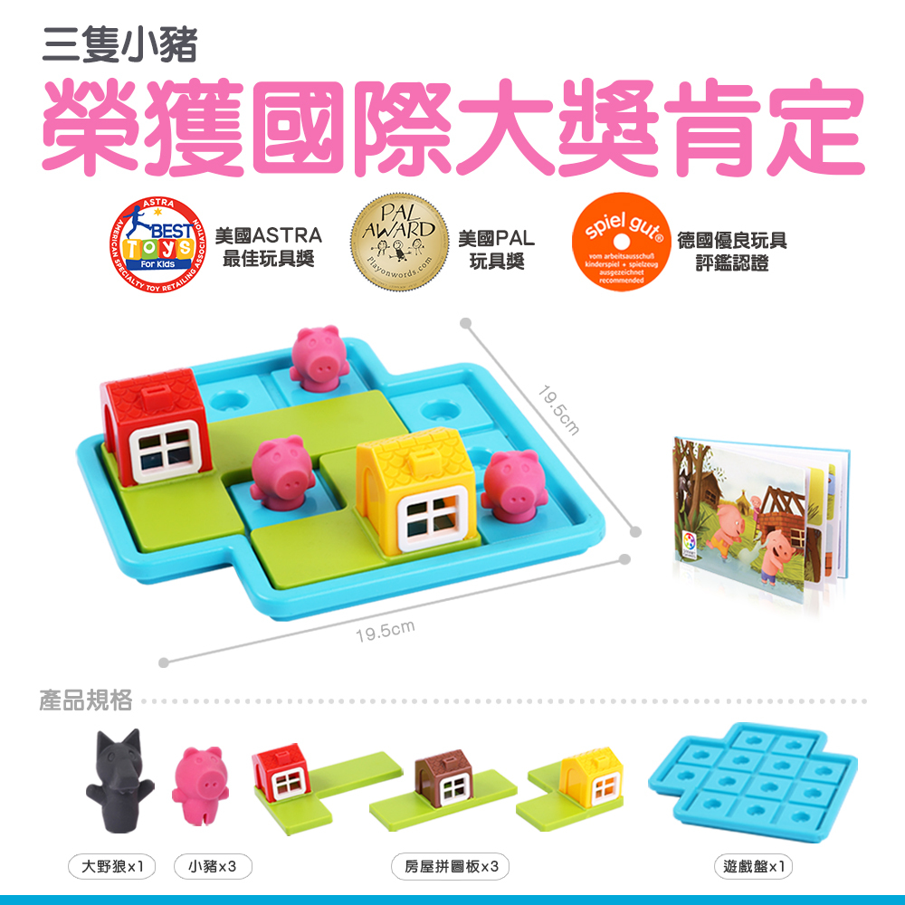 「三隻小豬」材質安全無臭味,通過歐盟及台灣安全玩具檢測,每套遊戲組合包含3隻小豬及1隻大野狼的角色公仔、3片房屋拼圖板以及1個遊戲盤、1本精美的無字圖畫書、1本遊戲手冊,為您和孩子帶來全方位、完整的遊戲體驗。