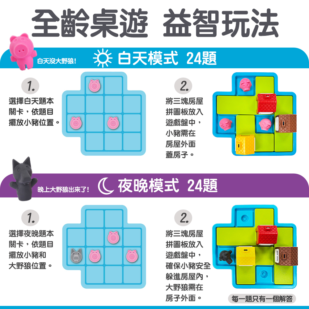 給大人的話透過選擇「白天」或「夜晚」題型,孩子們將面臨不同的情境挑戰。白天沒有大野狼出現時,小豬在戶外蓋房屋;而當夜幕降臨,大野狼現身時,小豬則需躲進屋子裡。共有48個遊戲關卡,四種難易等級,讓孩子們在挑戰中提升視覺與空間概念,並培養解決問題的能力,同時啟發逆向思維。