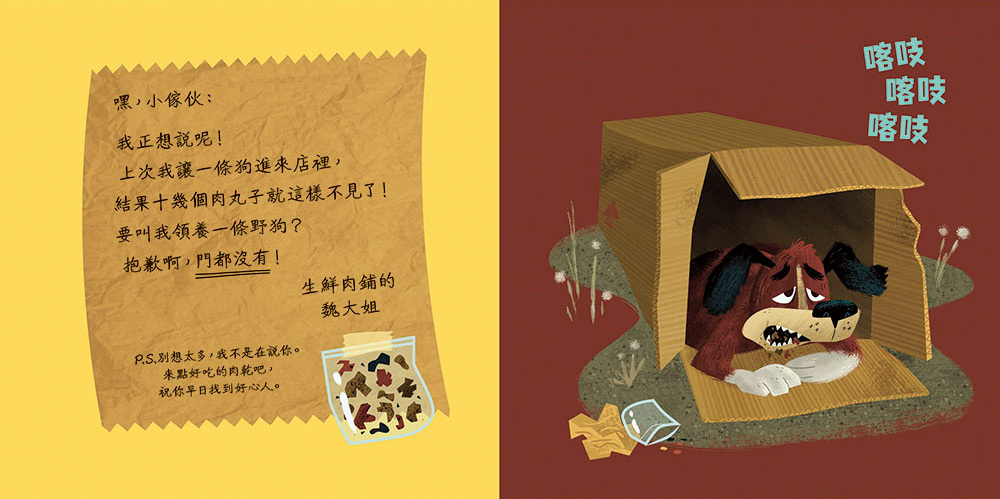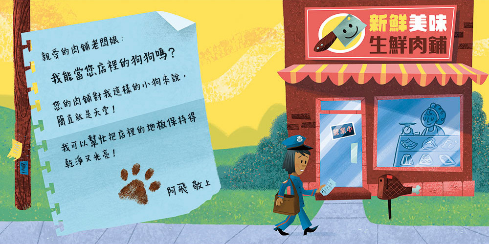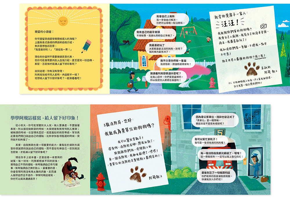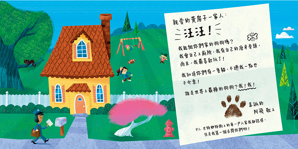 .這個故事太可愛了,扣人心弦,也很適合用來教應用文寫作。阿飛給街上每一戶人家都寫了信,向大家推薦自己是多麼完美的寵物,而且每個人都有各自量身定制、收養一隻狗狗的理由。這本書真是太完美了!