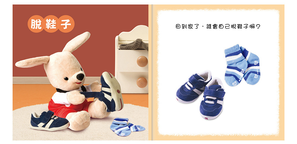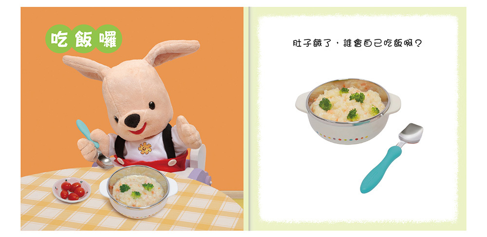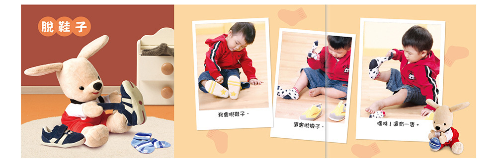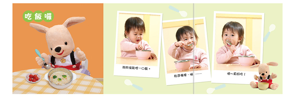 當孩子打開大翻頁時,書中以步驟式呈現真人實物的照片,熟悉的畫面很快地與自己的生活經驗產生連結,讓他產生共鳴,覺得「我也會!」當閱讀自然延伸至日常生活中,孩子藉由模仿、學習豆豆和書中主角,進而促進自理能力的養成,同時也建立起良好的生活習慣。