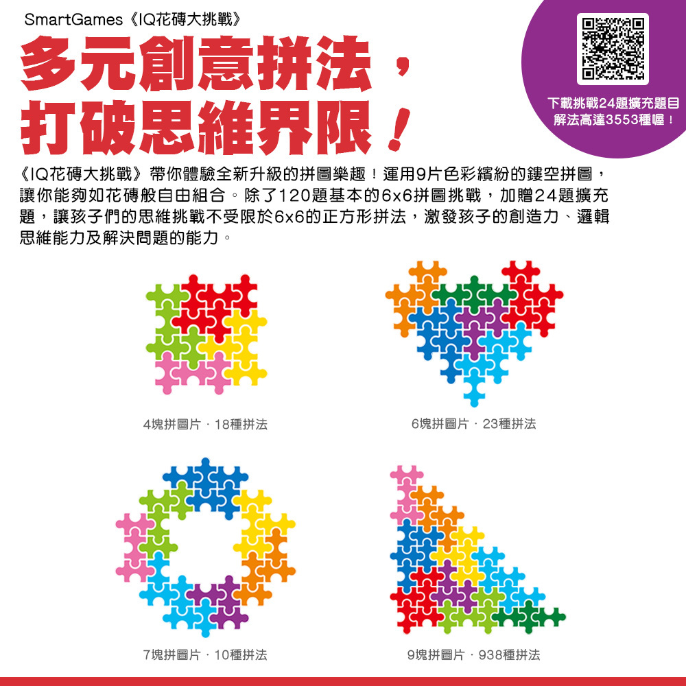 產品特色《IQ花磚大挑戰》促進多種認知能力發展:專注力、解決問題、邏輯思考1. 多元創意拼法,打破思維界限!《IQ花磚大挑戰》除了120題基本的6x6拼圖挑戰,加贈24題擴充題,這些題目具有多種拼法,高達3553種,讓孩子們的思維挑戰不受限於6x6的正方形拼法,激發孩子在挑戰中發現不同的思考方式,增強創造力和邏輯思維能力,並培養解決問題的能力。