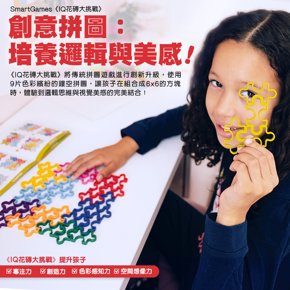 2. 創意拼圖:培養邏輯與美感!《IQ花磚大挑戰》將傳統拼圖遊戲進行創新升級,使用9片色彩繽紛的鏤空拼圖,讓孩子在組合成6x6的方塊時,體驗到邏輯思維與視覺美感的完美結合!