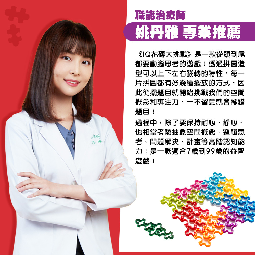 5. 專業推薦/職能治療師 姚丹雅《IQ花磚大挑戰》是一款從頭到尾都要動腦思考的遊戲!透過拼圖造型可以上下左右翻轉的特性,每一片拼圖都有好幾種擺放的方式,因此從擺題目就開始挑戰我們的空間概念和專注力,一不留意就會擺錯題目!過程中,除了要保持耐心、靜心,也相當考驗抽象空間概念、邏輯思考、問題解決、計畫等高階認知能力!是一款適合7歲到99歲的益智遊戲!