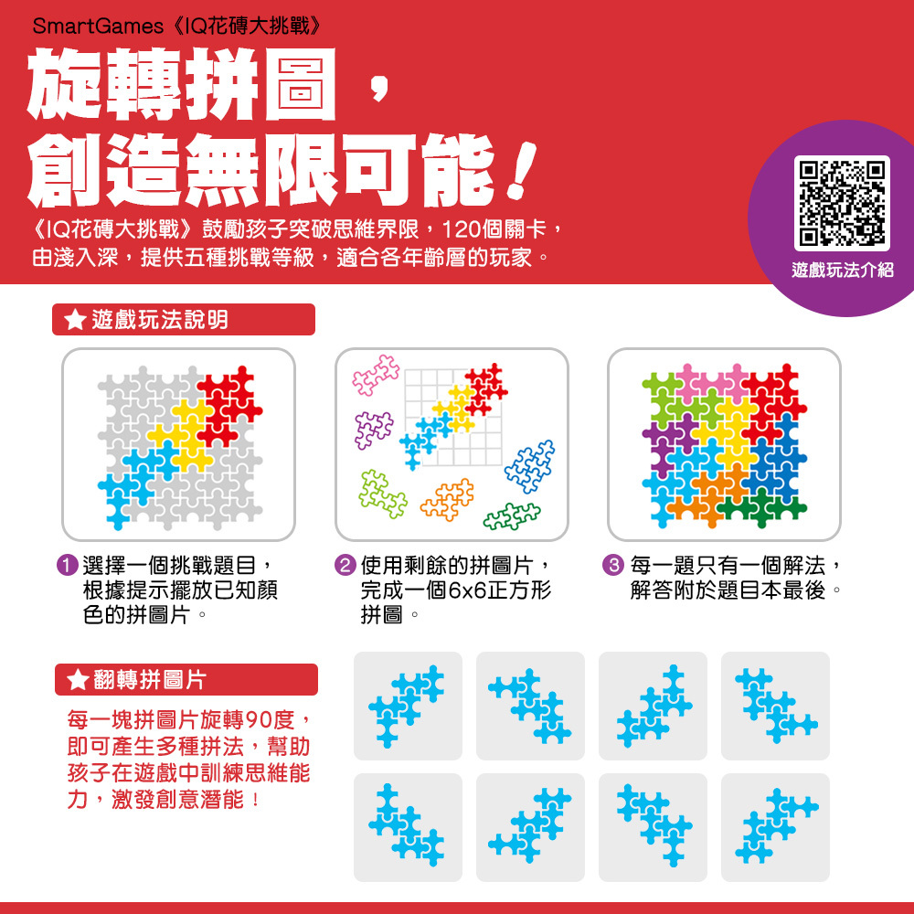 ※遊戲人數:1人自行解題,或2人輪流解題開啟親子、朋友共玩的模式。 《IQ花磚大挑戰》帶你體驗全新升級的拼圖樂趣!這款遊戲運用9片色彩繽紛的鏤空拼圖,讓你能夠如花磚般自由組合,創造出各種驚艷的6x6方塊。就算首次接觸IQ系列的大小朋友,這款直覺式的遊戲玩法都能輕鬆上手!《IQ花磚大挑戰》不僅是一款拼圖遊戲,更是促進專注力、邏輯思考和問題解決能力的絕佳工具!快來一起挑戰思維的極限,享受拼圖的樂趣吧!