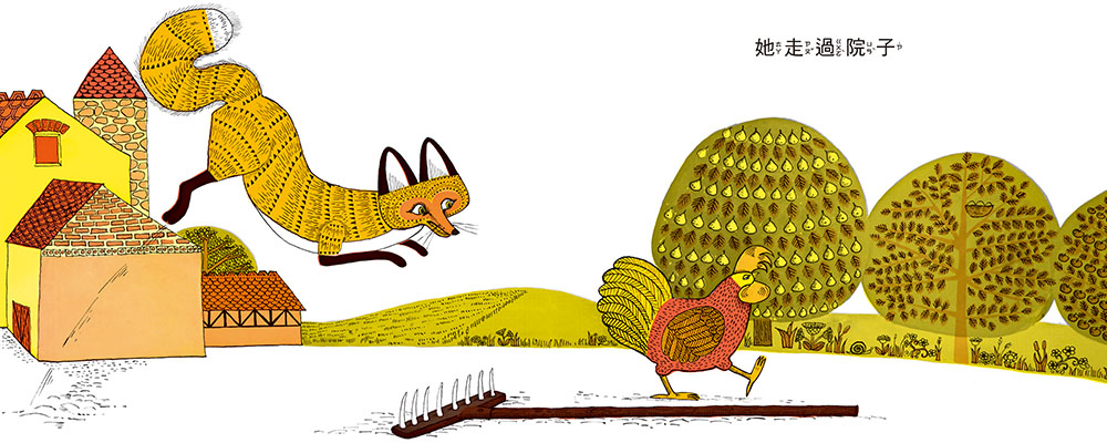 雖然作者佩特.哈群斯只用36個字(中譯本有44個字),輕描淡寫的說了一隻母雞出門散步的過程。然而圖畫卻大大超越文字的描述,把母雞被狐狸跟蹤、狐狸卻老是撲空的情節,生動呈現出來。