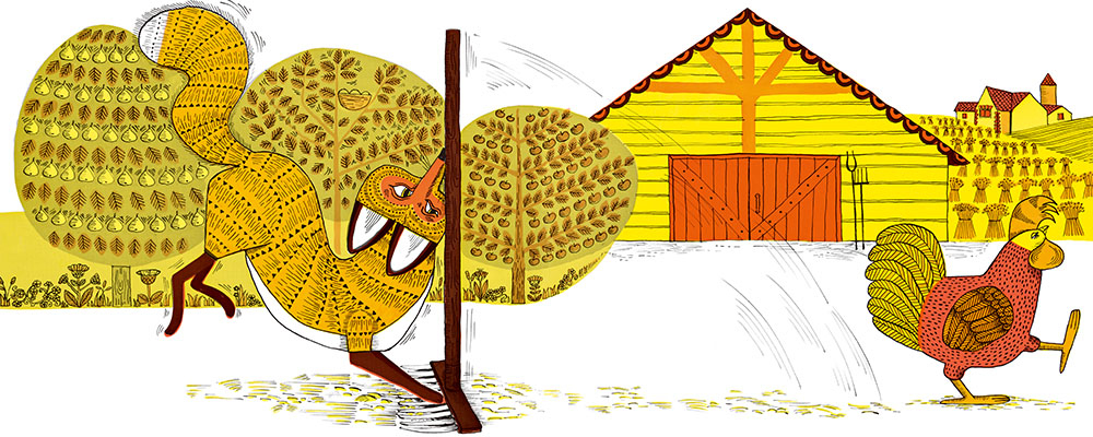哈群斯採用紅、黃、綠色,繪畫鄉間農場的自然之美。在母雞蘿絲的表情刻畫上,她把蘿絲畫得裝飾味極濃,這隻母雞永遠閉著眼睛,從頭到尾保持同個姿勢悠哉散步,好像永遠處在狀況外,不知道自己被狡猾的狐狸跟蹤。