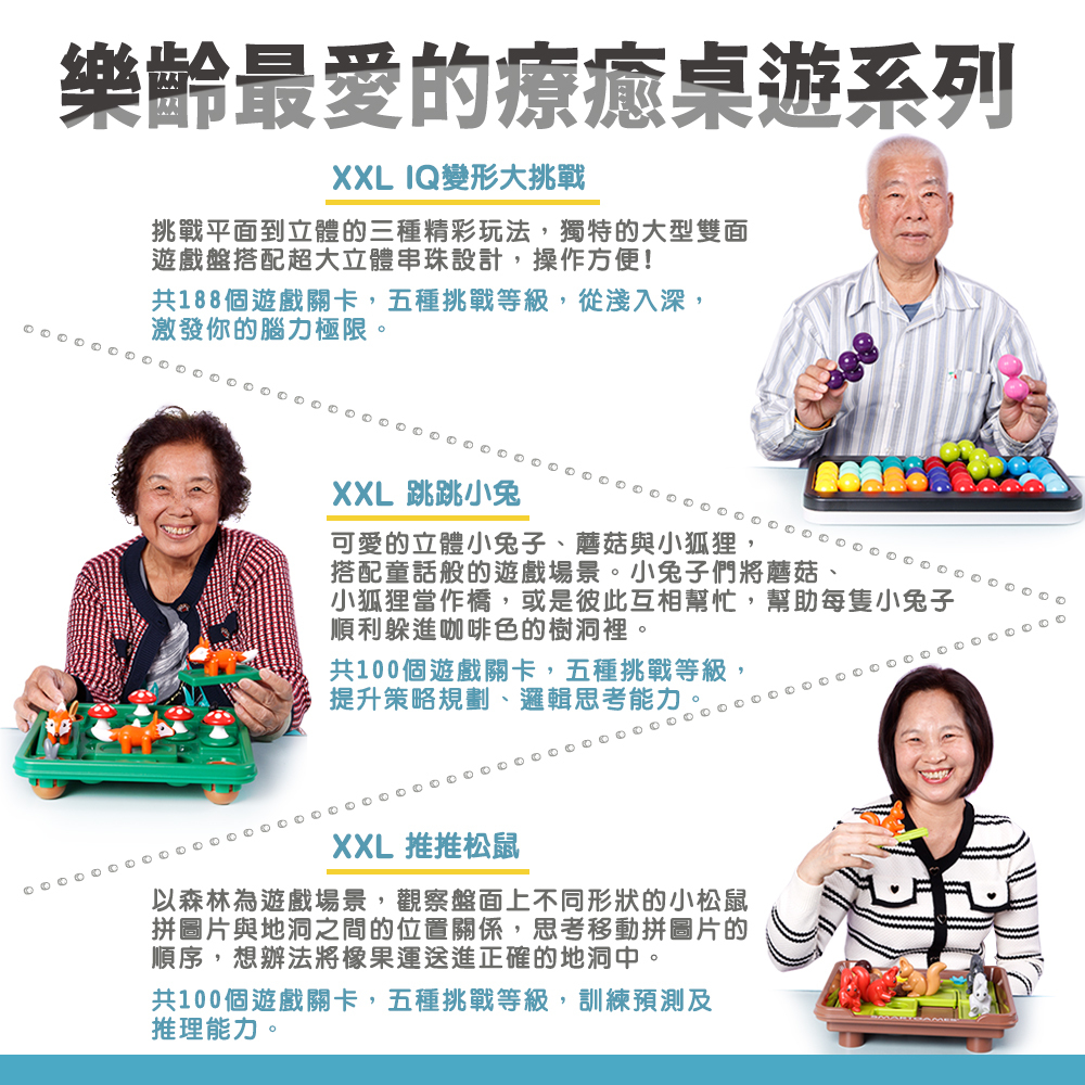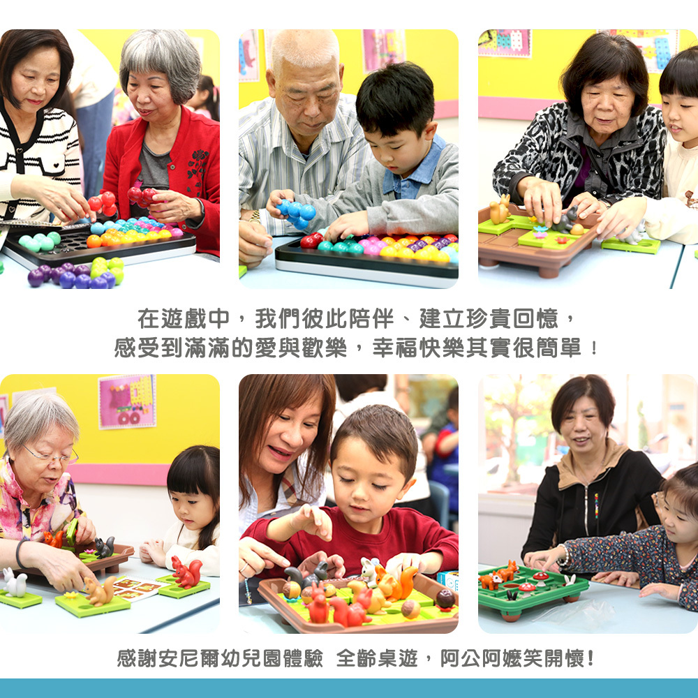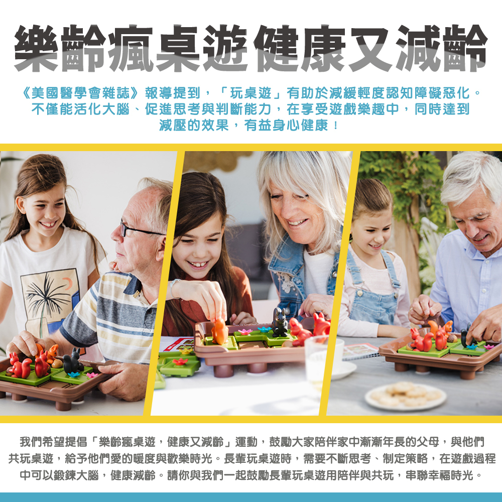 松鼠公仔不只是遊戲中的道具,可愛又討喜的造型,更能吸引長輩們願意主動參與遊戲,也增進和親朋好友的交流機會。在移動松鼠拼圖片、巧妙地將橡果推進樹洞,不僅能激發長輩思考能力,同時也讓他們感受到達成目標的成就感!這樣的互動,不僅加強家人之間的感情,共享陪伴與歡笑的美好時刻,同時也培養了長輩們在玩桌遊的過程中,保持活躍思維的習慣。
